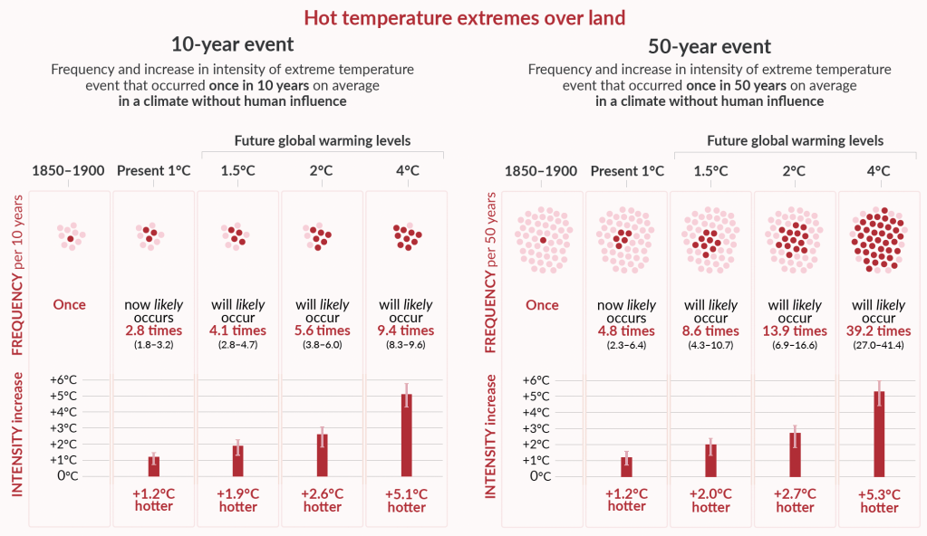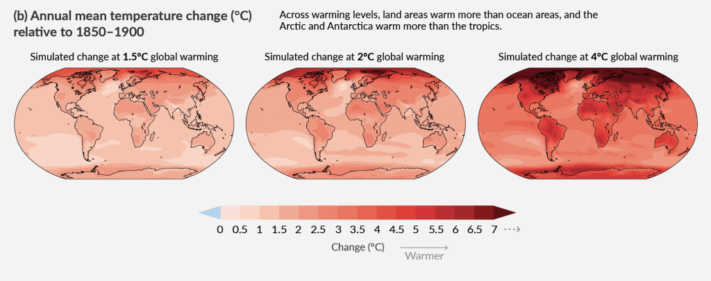 Jesteśmy obecnie na drodze do wzrostu średniej temperatury na świecie o 2,7°C (wg SSP2-4.5, Szósty raport IPCC), ale w najbardziej pesymistycznych scenariuszach wzrost ten może wynieść nawet 5°C (SSP5-8.5). Wartości te to średnie światowe – a wiadomo, że klimat Europy ociepla się dużo szybciej niż inne części globu, zwłaszcza oceanów.